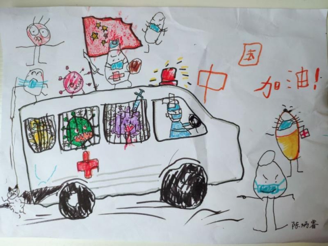 每天听家人讲这段全国人民抗疫期间的各种事,全国的医护人员、警察叔叔、志愿者们齐心协力共同对抗新型冠状病毒,我想到画一个救护车,关了一些被打败的坏病毒,在前进的路上,还有一些带口罩的胶囊战士帮助医护人员打败了病毒,战士们形态表情各异,车上还有一面飘扬的红旗,代表着中国必胜!爸爸说:“没有什么困难能打到英勇的中国人民!”我们家里,爸爸妈妈爷爷小姨都在抗疫一线,我也希望自己以后能像钟南山爷爷那样,发明出胶囊战士打败病毒!中国加油!