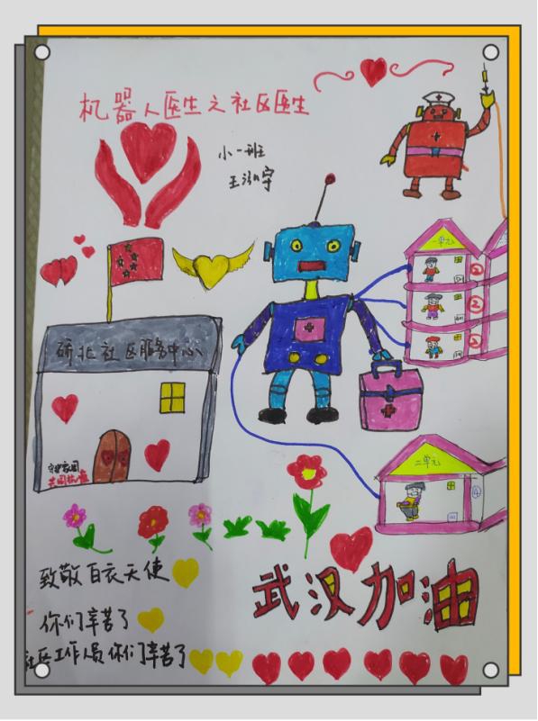 新冠病毒的爆发啦!为了病人快点好起来,医生伯伯、社区阿姨好忙啊!我希望大家快点好起来!我设计了社区机器人医生,专门给新冠病人上门送药和打针。社区里住的每位居民都可以通过门口的可视门铃呼叫社区机器人医生,也可通过社区群用语音联系机器人医生。这样独自在家的爷爷奶奶也可以享受到机器人医生的上门服务啦!这个社区机器人医生可不一般哦!它体内有个医药箱,里面有各类常备药品,可以根据大家的登记,准时将药送到,也可以为大家测量体温。并且机器人医生会连接医疗保健网,很多需要打疫苗的我的同伴-宝宝们不用出门也能打针。社区机器人可以让医生伯伯们稍微休息下!在社区检查身体,避免大家交叉感染。希望以后机器人医生能够在社区、医院、幼儿园里发挥他们的能量,为人类提供全方位的健康服务。