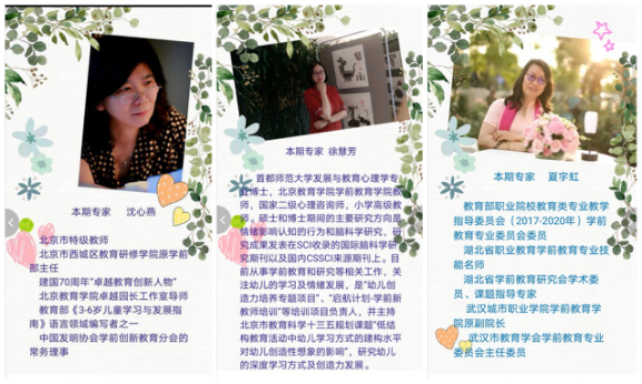 仲春初四日,春色正中分。绿野徘徊月,晴天断续云。春分到,沉睡很久的英雄“武汉”马上就要苏醒,在社会各界人士的努力和拼搏下,湖北各城市的上空也都升起了久违地烟火气息,在段满怀期待地时间里,湖北幼教也未曾停下脚步,即上期由中国发明协会学前创新教育分会联合夏宇虹省级名师工作室共同举办的“我是防疫小卫士——抗击新冠肺炎家庭亲子创意作品网络交流研讨活动”第一期湖北武汉幼儿创意作品分享及云教研交流会后,湖北幼教界掀起一阵热烈的浪潮,3月27日下午2:00湖北省幼教人齐聚云端,在期盼中第二期的“空中”教研如期而至。硚口区崇仁路幼儿园李菲园长担任此次教研活动的主持工作,北京市特级教师沈心燕、首都师范大学发展与教育心理学专业博士徐慧芳、教育部职业院校教育类专业教学指导委员会(2017-2020年)学前教育专业委员会委员夏宇虹担任本次活动评委,与湖北50多家园所、500名幼教人一同探讨作品中所蕴含的幼儿发展之价值。
