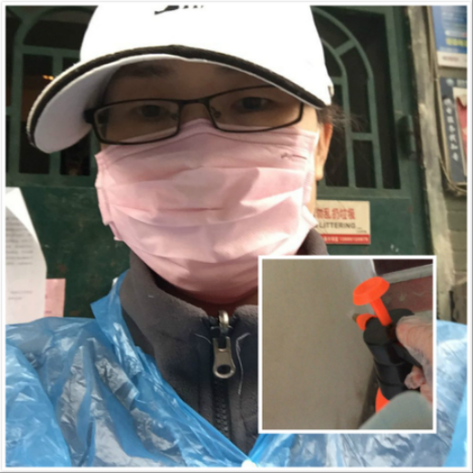 为增强小区防控效果,城南社区陈书记安排她负责社区消毒和卫生防疫工作。罗智梅老师二话没说,接下了这项任务,十几天来每天准时准点爬楼消毒,她说:“虽然不是一名党员,但作为一名人民教师,这个时候就应该站出来,做小区的忠诚守卫者!”