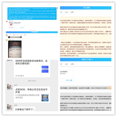 广泛宣传,营造氛围。由于受到新冠肺炎疫情的影响,今年的“全民国家安全教育日”法制宣传教育活动相较于以往比较特殊,主要是通过线上教育形式开展的。在4.15“全民国家安全教育日”到来之前,学院领导高度重视,及时向全院师生下发了学校《关于开展4·15”全民国家安全教育日法治宣传教育活动的通知》,并根据通知要求制定了具体的学院实施方案。要求全院师生开展以“全面贯彻落实总体国家安全观,统筹传统安全和非传统安全,坚决打赢疫情防控湖北保卫战、武汉保卫战,为决胜全面建成小康社会提供坚强保障”为主题的宣传活动。学院办公室提前收集《国家安全法》等法律法规和国家安全观宣传片等学习资料在工作群发放,指导全院师生认真组织开展好国家安全教育宣传活动。