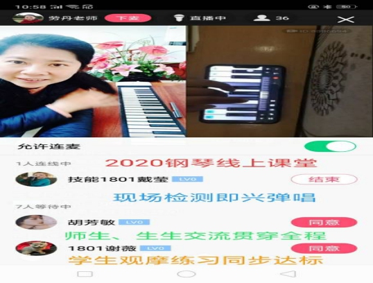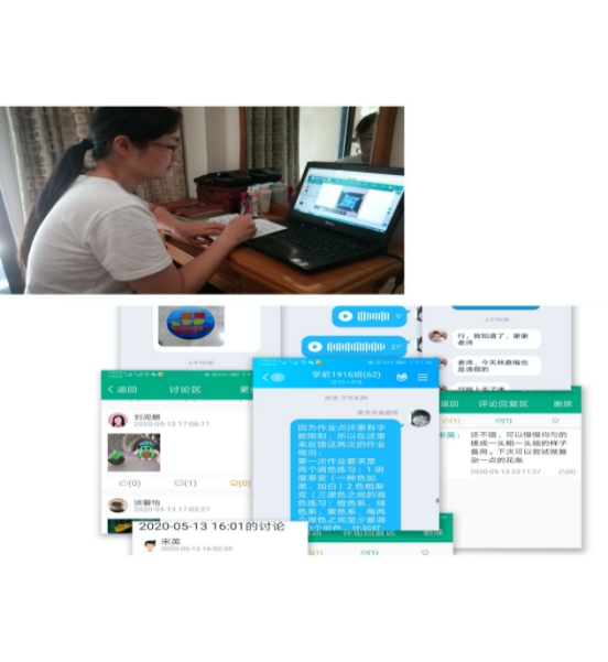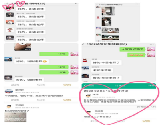 劳丹同志自学院2月份开展线上教学工作以来,一直探索知识技能与幼教素质双轨运行模式,积极思考运用网络资源优势,努力开拓线上教学新格局。她主讲的钢琴弹唱线上教学目前采用QQ直播或腾讯会议随时监管教学效果,采用线下录播及时解答课后练习疑难方式,采用公益直播课堂拓展钢琴音乐鉴赏视野,保障线上线下知识技能同步关联。