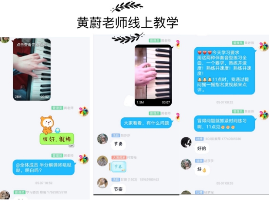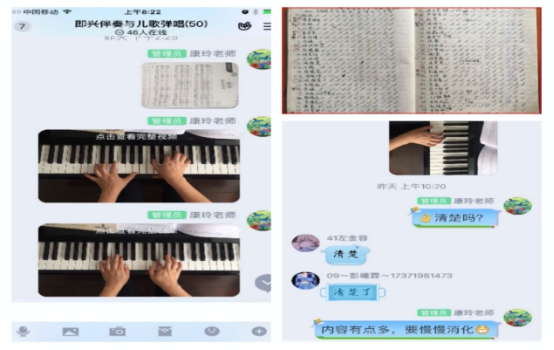 教师第一支部统战委员康玲同志在即兴伴奏的线上教学中考虑到大多数学生家里没有钢琴,让学生画纸键盘、用手机键盘app来完成学习任务,弹奏的曲子虽然不难,但是在巴掌大的app上想弹好还是有难度。学生们都很努力,不论是在城市还是乡村,哪怕是周围嘈杂,伴随着鸟鸣、鸡叫、家人谈话、电视剧的声音,都认真完成老师布置的任务。为了提高学习效率,让伴奏音型的练习落到实处,她鼓励学生先单手弹唱(手机app音域有限,不能双手合奏),再用剪映app合成,学生通过合成进一步锻炼了音乐综合能力、还get了新技能,掌握了新技术,同时提高了信息技术能力。