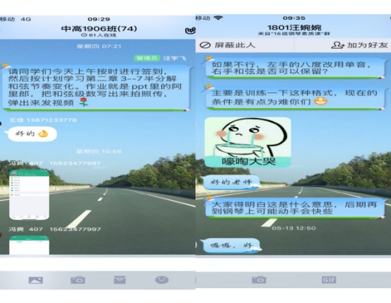 郭轩同志作为五年17级的钢琴课程负责人,积极和1702五年的孙戎老师开展线上线上教研活动。针对学生的学习情况开展调查,针对五年的学生特点,制定教学计划。充分利用qq群,微信群,智慧职教教学平台,充分发挥信息化教学技术。同时他积极向教研室有经验的同志交流,向康玲同志学习,让没有钢琴的学生用剪印软件app,将学生的儿歌演唱、儿歌左手、右手进行组合。学生也发挥了他们的主动积极性,积极克服困难,顺利完成教学。