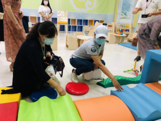 参观伊始,在主办方的讲解下,一行人参观了爱立方“游戏成长”托育整体解决方案中的托育教室。主办方介绍道,为对接2-3岁儿童的托育需求,完善目前市场上托育方案的各类缺陷,爱立方根据儿童身心特点,通过科学地划分与摆放,为儿童创设了七大发展区角,分别是:感统训练区、集体活动区、建构游戏区、益智思维区、科学探索区、艺术启蒙区以及生活启蒙区。区角的制定结合了2-3岁儿童的身心需求,材料上体现出“软、圆、矮、趣、变”等特点,充分以儿童的视角予以投放,在保障儿童身心安全的前提下,激发儿童的多维成长。学院卓院长、科研处熊处长,认真聆听相关讲解,并实地进行体验,提出了有益的建议。