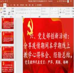 “5+N”会议模式,本月在“N”上进行了创新,围绕主题“分享疫情期间本学期线上教学心得体会”,支部所包括的三个教研室代表——严萍、周颖、杨娜进行了线上教学分享。