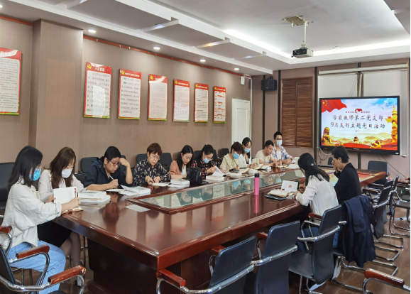 在诵读党章环节,学前教师第二党支部全体党员一起诵读了党章第九章《党组》第四十八、四十九、五十条。根据9月份重点学习文件,学前教师第二党支部全体党员一起认真学习习近平总书记在中央政治局第二十二次集体学习时的重要讲话精神,深入学习贯彻习近平总书记关于制止餐饮浪费的重要指示精神,集体学习研讨了《习近平谈治国理政》第三卷,认真学习了8 月 18 日市委常委会(扩大)会议精神以及参与文明城市创建工作和全市党风廉政建设宣传月活动。龙宇副书记传达了马豫书记的党课《强化清廉实干担当 聚力决胜全面小康》精神,希望全体支部党员认真学习领会。