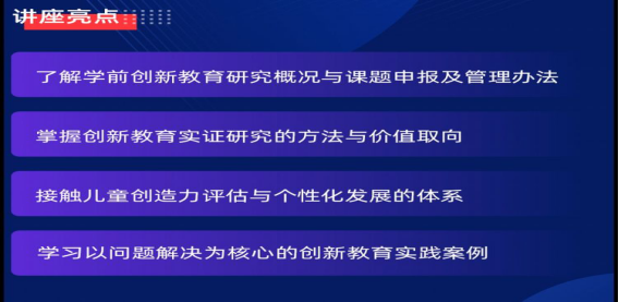 王教授从三个方面帮我们做了解析:1.我国学前创造教育研究概况;2.学前创造教育课题研究指南;3.学前创造教育研究课题管理,通过这三点的解析让我们了解了课题选题、课题申报和课题管理的流程和要求,帮助我们找准申报课题的方向,能更有效的开展课题活动。