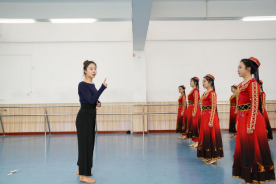在舞蹈教室,学生们穿着整齐的维吾尔服装跟着张晓涵老师的节奏进行《维吾尔族舞蹈造型创编》课程的学习,每个动作分解、示范、逐一指导,让学生们不仅学习了舞蹈动作,更感受到老师对舞蹈的执着、认真精神。
