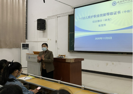 被安排在10月中旬至11月初,分三天对18级200名学前和幼管专业在校生展开。由张雪萍、高芳梅、罗智梅、康琳、吴淋果、王俊、郭雅婷等老师负责,内容为语言认知/社会性亲子活动、动作发展、安全防护、日常保健、生活照护、环境创设、安全防护等模块,帮助考生们奠定了理论基础。