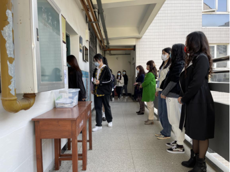考试当天两所中职学校在校门口进行了考生及监考老师的体温检测及消毒工作,经扫码亮码、体温检测、身体扫描、双手消毒等环节再进入学校。各个考场入口也都配备了额温枪、免洗消毒液、扫描仪等物资,学生有序排队进入考场。