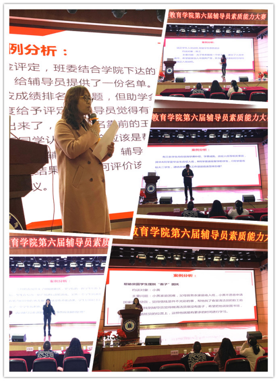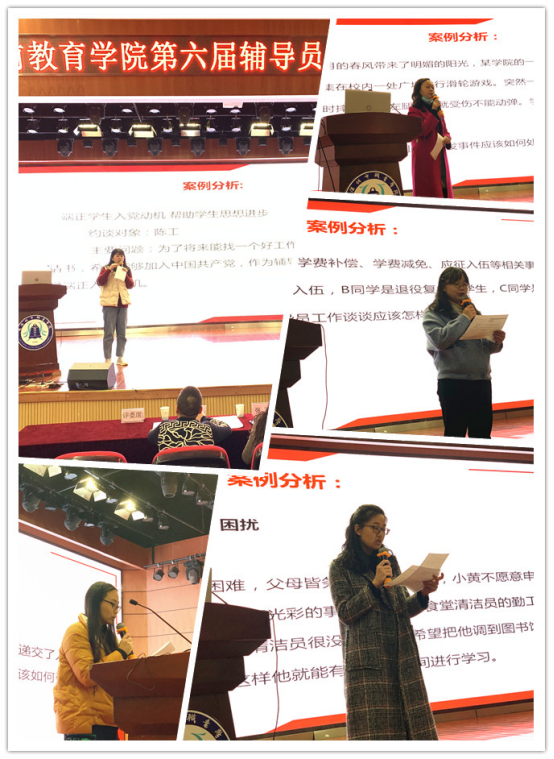 大赛设有“基础理论测试”和“案例分析”两个环节,共11位辅导员参赛。在“案例分析”环节,11名辅导员围绕核心问题、阐述解决思路、实施办法及相关启示,解答中渗透了导员们的工作理念,展现出辅导员在学生工作理论、方法指导下解决问题的高超能力,展示了我们辅导员们的工作魅力与风采。