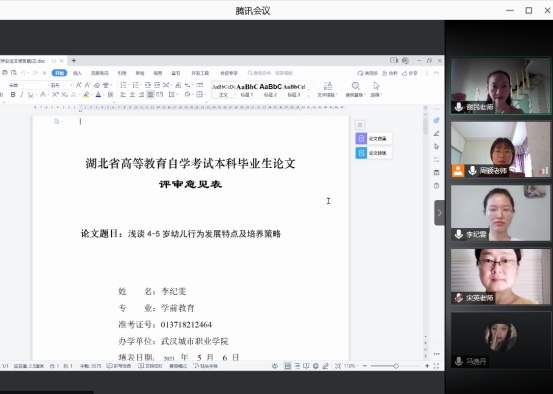 59日在腾讯会议云端,我们举行了2021年学前教育专业自考专升本论文答辩会。答辩学生、指导老师通过网络平台进行线上论文指导和答辩,华中师范大学继续教育学院自考办公室李主任、继续教育学院、伟徳官网全体领导及教研室主任参与答辩会。