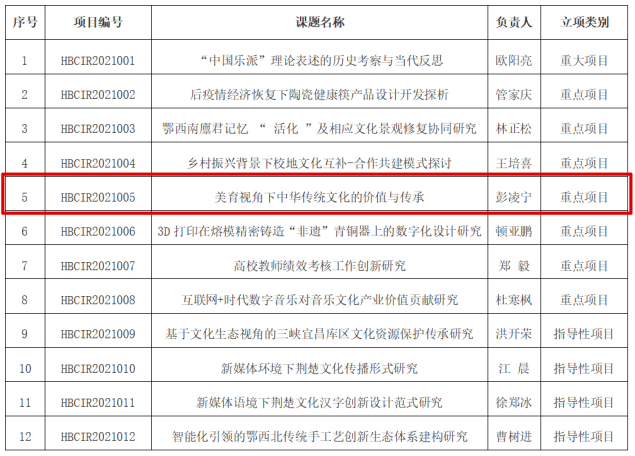 近日,湖北省普通高等学校人文社会科学重点研究基地——湖北文化产业经济研究中心2021年度开放基金项目立项评审结果公布,我们美术教研室教师彭凌宁主持,课题组成员马少林、赵一婷、熊瑞共同申报的“美育视角下中华传统文化的价值与传承”获批重点项目。