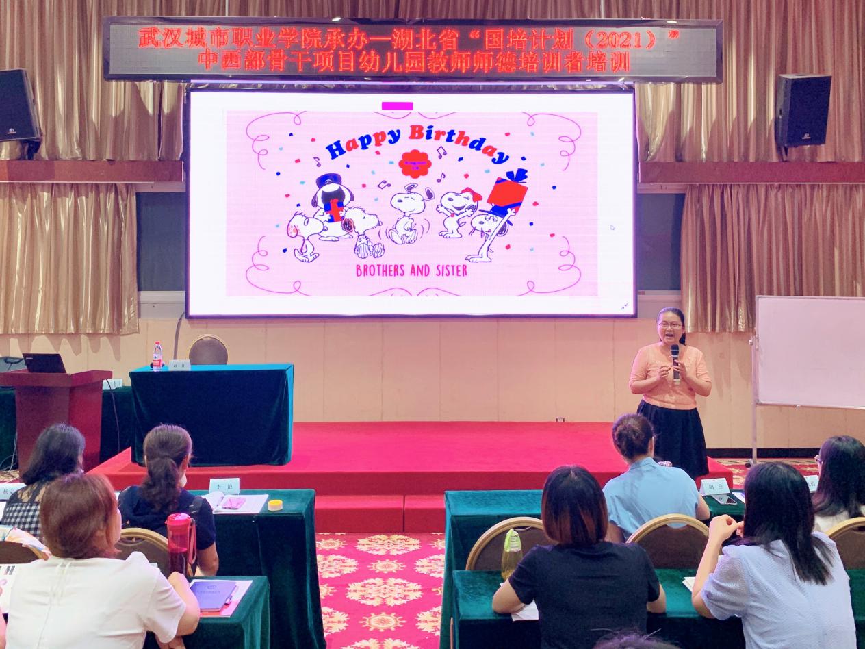 下午2:00,黄老师分别请出了孝昌县鑫乐幼儿园的刘洁萤老师、鄂州市梁子湖区太和镇中心幼儿园的陈姣老师、黄石市西塞山区星月幼儿园的刘丽华老师、阳新县金太阳幼儿园的华晓燕老师、竹溪县机关幼儿园陈艳美老师、黄石市黄石港区黄棉昌大公司幼儿园王珺老师,全体学员为她们送上了生日祝福,继续教育学院董云燕主任为她们送上了特别的生日礼物。