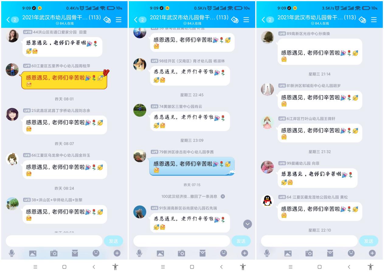 拥有一颗感恩之心是获得幸福的来源,在当前疫情下,我们可以参加这样有高度、有深度、有外延的培训,见识如此多的专家、教授、园长,给我们武汉市教育工作者提供这样专业化平台。真心要感谢武汉市中小学继续教育中心和武汉市城市职业学院给予我们成长的机会,尤其是在克服线上培训的种种困难下,看到了精彩的课程分享。