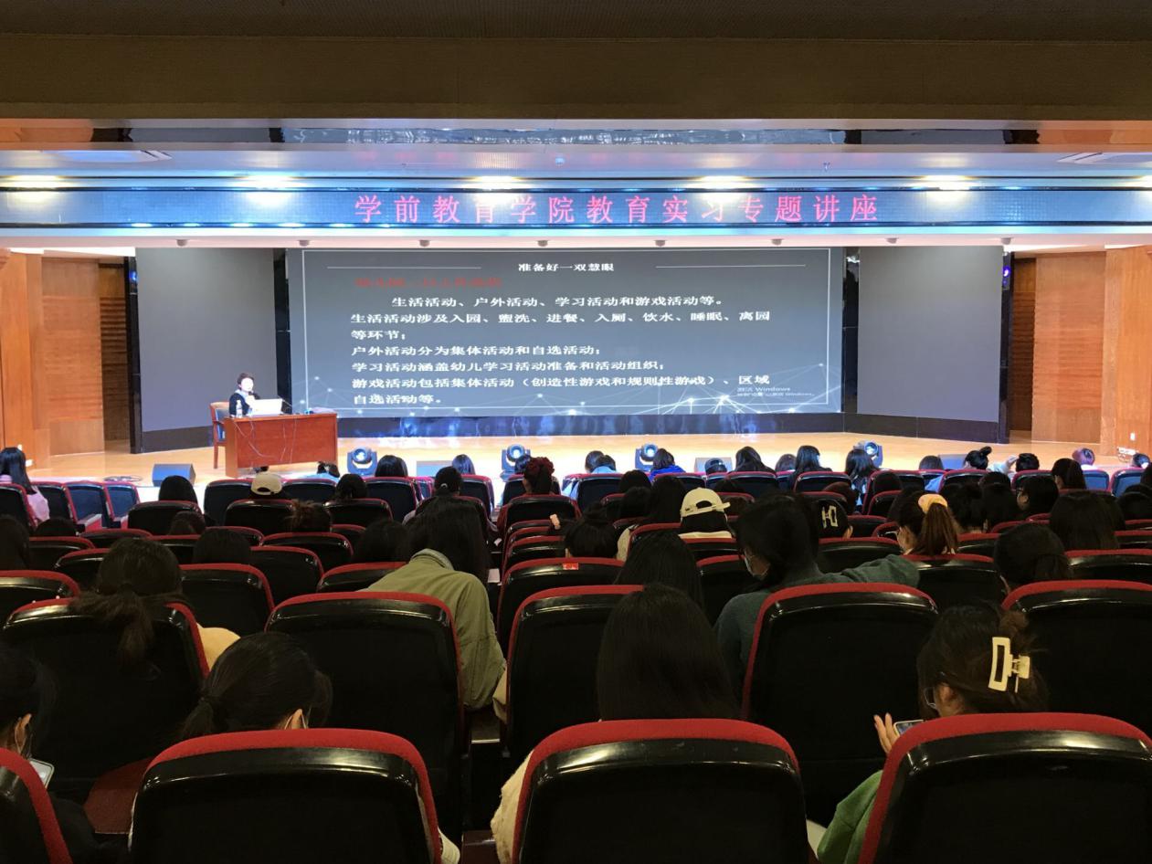 2021年教育实习即将于11月15日拉开帷幕,为帮助学生进一步了解幼儿园,推进学院学生毕业实习工作,使学生对实习有正确认识并以积极心态去迎接实习,学院于11月10日召开教育实习专题讲座,讲座邀请了武汉市示范幼儿园丁字桥幼儿园园长黄智莺进行讲座,参加教育实习的全体毕业班同学参加讲座。