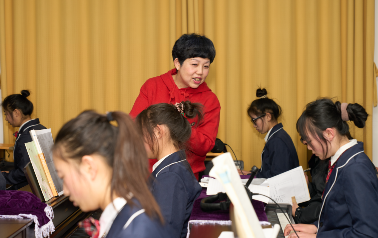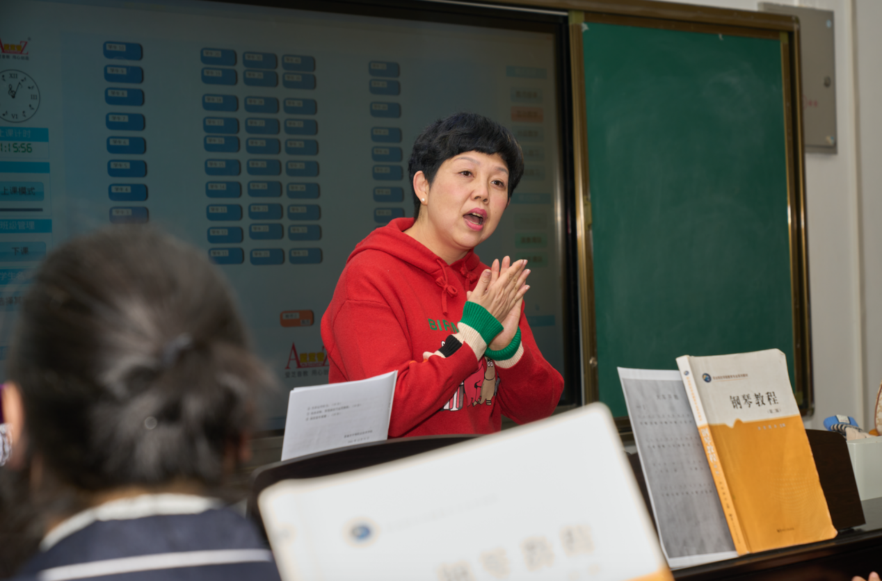 随后同学们在黄蔚老师欢乐的开场互动中进入了第二堂即兴伴奏与儿歌弹唱课《火车开了》。黄老师在教学过程中非常重视对学生创造力和表现力的培养,利用游戏、小组协作等教学方法,引导学生用多种表现方式表达弹唱歌曲的节奏和情绪,让学生进行了一场奇妙的音乐之旅。