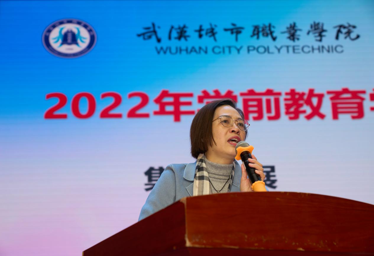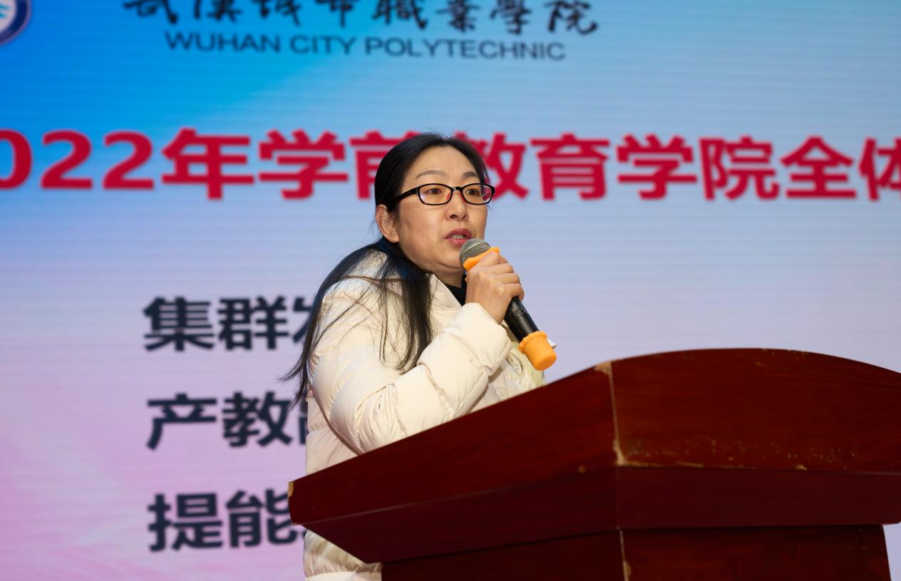 学院院长卓萍回顾了上一年度学院在技能高考组考、三教改革、立项学前教育专业群建设等重点工作上取得的骄人成绩,分析了学院办学发展面临的新形势,她指出2022年是党的二十大召开之年,更是学校深入实施“十四五”规划的关键之年,全院上下必须勠力同心、笃行不怠,面对新形势,寻找新思路,树立新追求,促进新发展,要扬优势、破难点,补短板,为奋力推进学校事业高质量发展再上新台阶贡献自己的力量。卓萍院长围绕学院2022年“产教融合建设主题年”阐述部署四大方面工作。一是要加强学习,我们要从专业前沿理论、国家方针政策中汲取养分,让学习成为前行的不竭动力。二是要开启专业群建设的新征程,充分认识到专业发展面临的严峻形势,要成立专班,制定任务表,取得标志性的成果。三是“三教改革”进入深水区。专业教师要发挥引领作用,立德树人,积极联通专业链、产业链、岗位链和人才链;教材资源建设要做精做优;教师要注重与学生思维、情感的交流,采用适应学生学情的教法,提高人才培养质量。四是产教融合、工学结合。要把“产教融合”变成学前人的自觉,利用学前职教集团,将其建设成高水平的产业融合的平台。