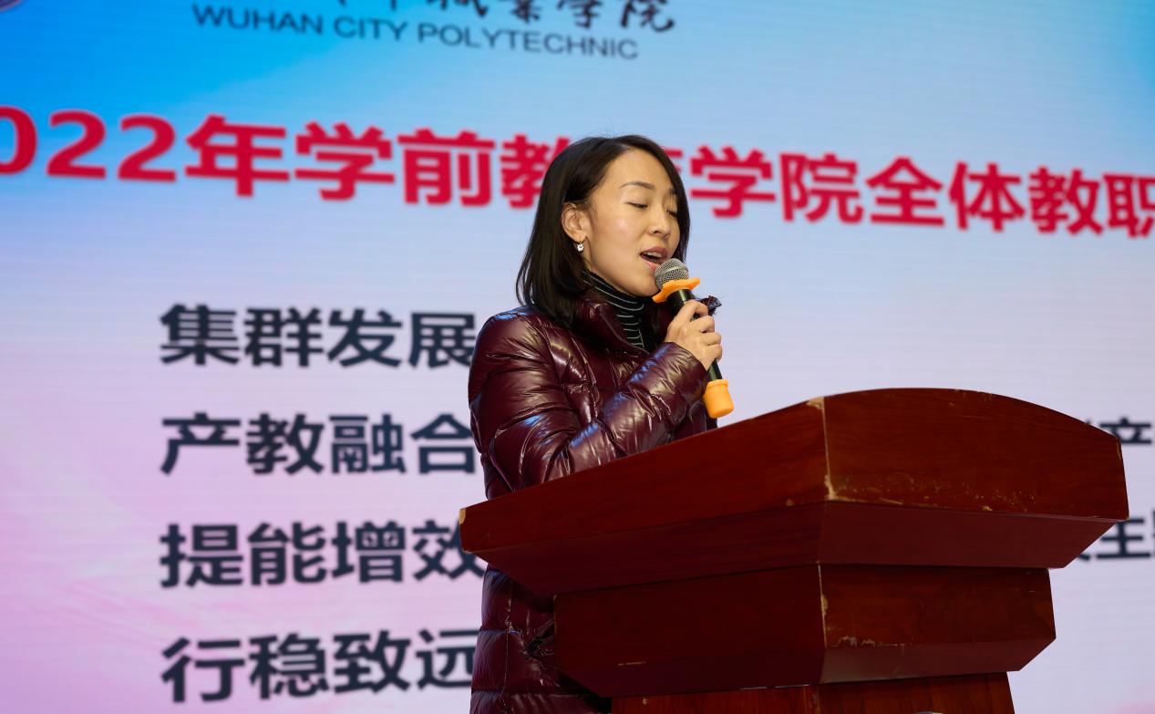 “一年春做首,万事行为先。同心山成玉,协力土变金。”新春伊始的这场大会是一场鼓舞士气、催人奋进的大会,是一场凝心聚力共话美好新愿景的大会,更是一场加油实干谱写学前发展新篇章的大会。2022年,学前人将以立德树人为根本,以质量提升为核心,提振比学赶超精气神,弘扬争先创优正能量,砥砺深耕,为学院产教融合建设贡献力量,以优异成绩迎接党的二十大胜利召开!