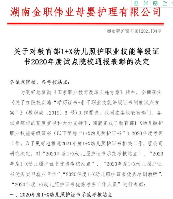 据悉,伟徳官网自2020年开展1+X幼儿照护证书培训、考试工作以来,在校领导、院领导的高度重视下,成立专项领导小组,建立证书培训运行机制,制订专门考核方案,落实考评要求,梳理考试流程,细化物料准备,受到湖南金职伟业母婴护理有限公司充分肯定和高度赞扬,2020年被评为示范考核站点。