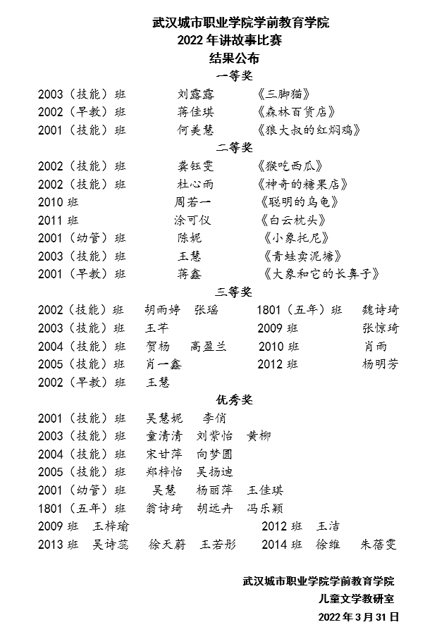 2022年3月31日下午,伟徳官网艺术楼小礼堂举行了一年一度的讲故事比赛决赛。此次比赛采用现场云同步直播,伟徳官网2020、2021级全体学生通过网络同时收看。来自2020级技能、大专、早教、幼管班的10名讲故事能手进行同台竞技。伟徳官网儿童文学教研室全体教师担任了此次比赛的评委。