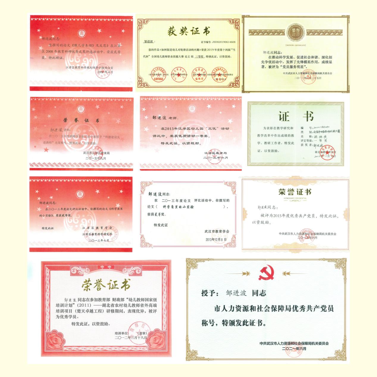 工作再忙碌也停不下他学习的脚步,通过孜孜不倦,努力学习,先后取得了江汉大学教育学本科、中共武汉市委党校研究生学历。他坚持“每日一课、每周一思、每月一叙事笔记、每年一论文”,多次承担科学领域的教学观摩活动,近10余篇论文在国家、省、市获奖,多篇教学案例及论文在不同刊物发表。2014年湖北教育电视台以“男幼师的育儿经”为题对其进行了专访。连续多年,利用寒暑期时间积极参与市妇联组织的“家教大讲堂”活动,将亲子体育游戏送进社区,让孩子们乐在脚尖,爱在心田。