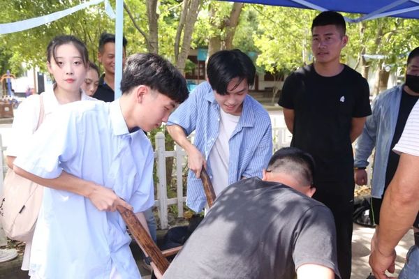 最有意思的当属打糍粑了,队员们两人一组你提我打,最后大家一起分享打出来的糍粑。
