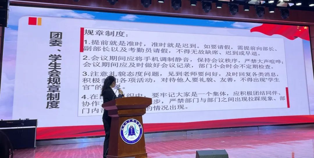 会议的最后,院团委学生副书记兼学生会轮值主席胡敏宣读了院团委、学生会的规章制度。她表示院团委、学生会所有成员应遵守规章制度,严格要求自己,铭记自己的责任与担当。院团委、学生会的每一个成员都是大家庭的一份子,应相互帮助,共同进步,为建设更好的团委、学生会而奋斗努力。